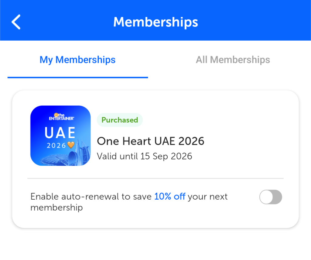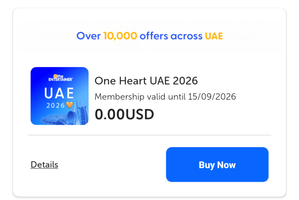The One Heart membership is a special promotional version of the Entertainer launched during the “Our Home. Our Heart.” initiative. It gives users access to selected Buy One Get One Free offers across restaurants, attractions, and lifestyle venues in the UAE.