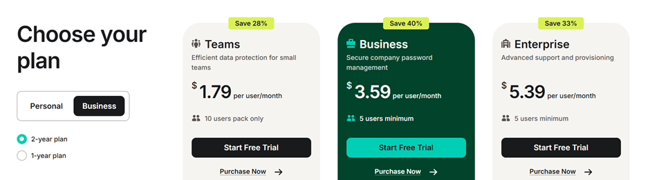 NordPass offers flexible plans for individuals, families, and businesses. The Premium plan unlocks advanced features like password health reports, data breach scanner, and secure password sharing. There’s also a Family plan that allows multiple users to manage passwords safely under one subscription.